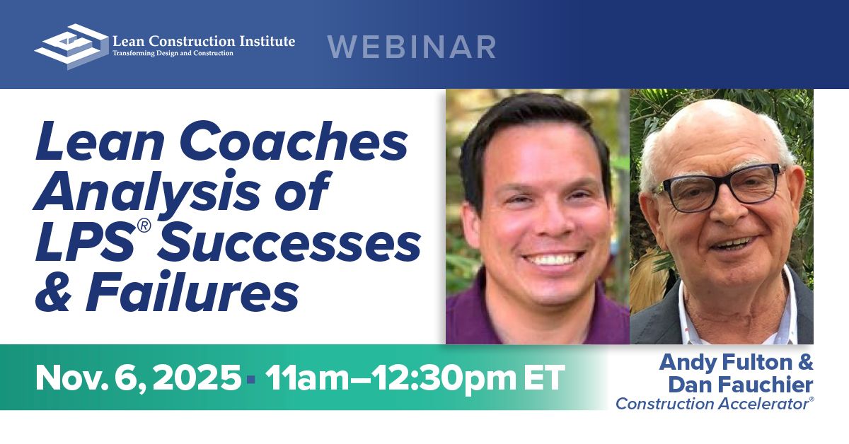 Join Lean coaches Dan Fauchier and Andy Fulton for a visual, insight-packed 90-minute interactive webinar based on 19 years of experience across 400+ Last Planner System® sessions. Learn what works, what doesn’t, and how to improve your LPS® implementation. Get practical tips on team selection, logistical preparation, linking plans, virtual tools, and trade partner engagement. Ideal for those using or planning to use LPS on projects.