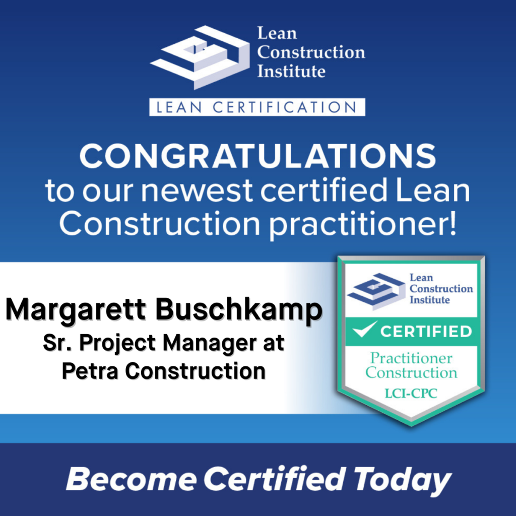 We’re excited to feature Margarett Buschkamp, one of the newest LCI-CPC certificants. Her dedication to Lean practices and improving the construction industry is evident in her journey to certification. We asked Margarett to share how earning this certification has impacted her career and what it means to her personally.