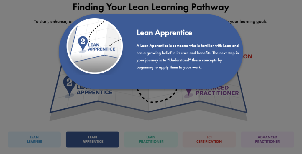 The Lean Learning Pathway breaks down your level of Lean knowledge into four distinct stages: Lean Learner, Lean Apprentice, Lean Practitioner, and Advanced Practitioner, with LCI Certification positioned between the last two.