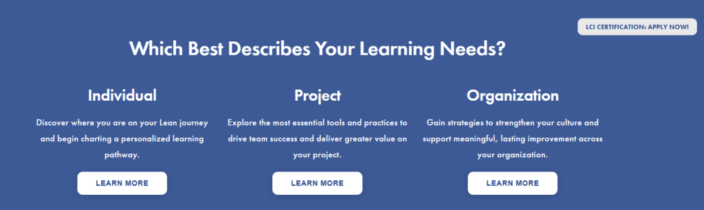 When you visit the new learning page, you’ll have the option to identify your learning needs based on how you need to implement Lean.