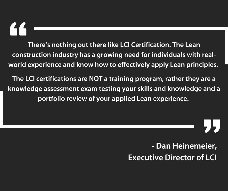 Through the LCI Certified Professional-Design (LCI-CPD) and LCI Certified Professional-Construction (LCI-CPC) you can show your nationally verified Lean experience and track record of applying Lean principles to real-life projects.