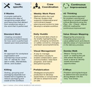 Methods – The core structure of the website and organization of the videos is to gather and organize simple, easy-to-follow information and examples for Lean methods, summarized in Figure 1. The methods are gathered from case studies of successful trade contractors and serve as commonly observed, simple and high-value methods for enabling field crews.