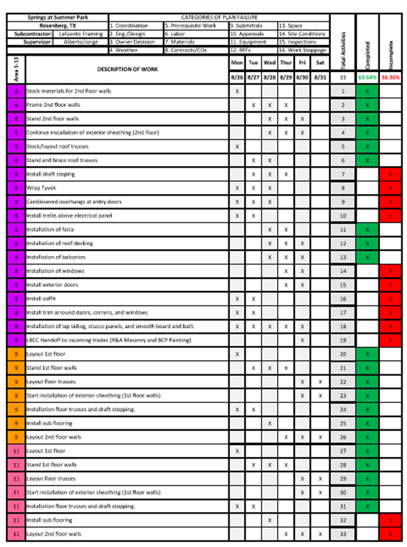 The project consisted of 12 two-story apartment buildings which were 24,000 square feet each, this included garages, pools, and a clubhouse which brought this project to a grand total of 309,319 square feet. Despite some delays, the clubhouse was delivered 2 months ahead of schedule and the overall project was completed 3 months ahead of schedule. CP has developed projects in 19 states employing top multifamily contractors using detailed CPM schedules. LBCC is the only CP contractor deploying both TPM and LPS®. These project results led CP to recommend that all contractors to use both TPM and LPS® production methods on future CP projects.