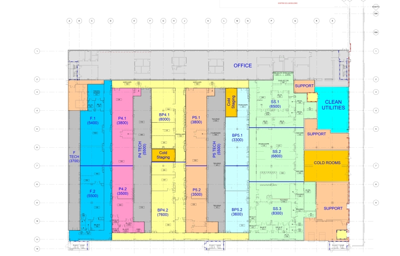 Projects of this complexity are comprised of many different build-types. In our case, the buildings were comprised of mechanical space, pipe rack space, clean utility space, office space, training rooms, electrical/CSR rooms, and the processing (clean room) suites. Each build-type (by level) was considered a zone, and each zone was evaluated for a takt versus pull approach. Zones assigned a pull approach exhibited long working duration activities (or boxcars) and would not be broken into areas. Zones assigned a takt approach exhibited repeatable sequences of work activities, with rhythmic durations, and were defined into areas (see Figure 1) based on a variety of factors, including the quantity of work, crew size, and duration.