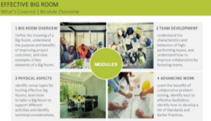 Effective Big Room eLearning addresses this challenge with real-world examples of onboarding documents that you can download and use with your team. The eLearning course itself is also a great tool for building consensus around the value and purpose of a Big Room among your company employees or project team because it enables self-paced learning from any smart device! E-Learning makes it possible to efficiently train tens or hundreds of employees and volume discounts of up to 75% off are available for LCI corporate members. Learn more by emailing eLearningdiscounts@leanconstruction.org.