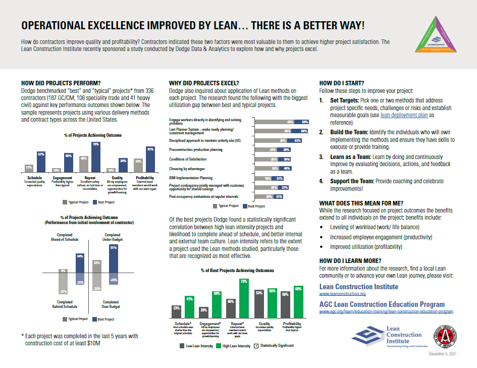 In 2021, the Lean Construction Institute & AGC co-sponsored research conducted in collaboration with Dodge Data & Analytics, which concluded that projects utilizing Lean methods are more often completed ahead of schedule and under budget. Lean streamlines logistics, creates a culture of collaboration, eliminates waste and overages and ultimately leads to more value for stakeholders.