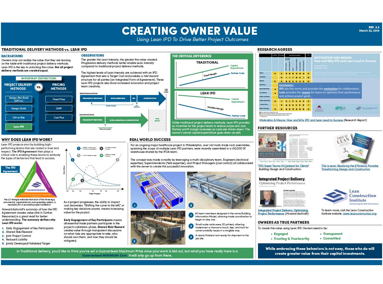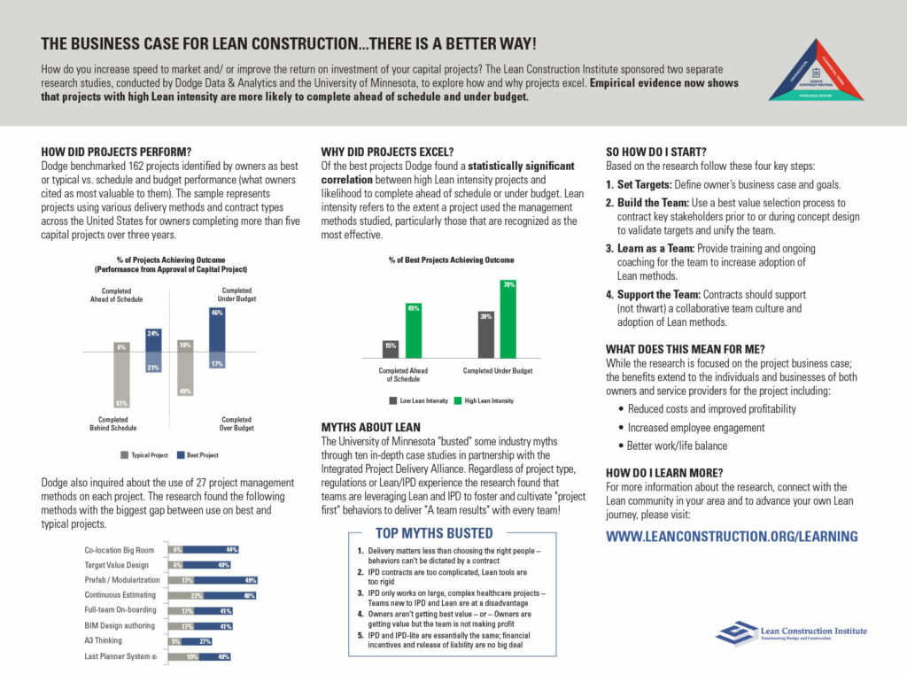In 2016, the Lean Construction Institute (LCI) in partnership with Dodge Data & Analytics sponsored an Owner outcome study called “Why do Projects Excel? The Business Case for Lean Project Delivery”.