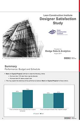 LCI followed up their research from the Owner perspective by including Designers in a study called “Why Projects Excel-Great Design Enabled by Lean” which compared best vs. typical projects, as well as design firm-relevant metrics to establish a benchmark of performance to reveal the impact of Lean methods.
