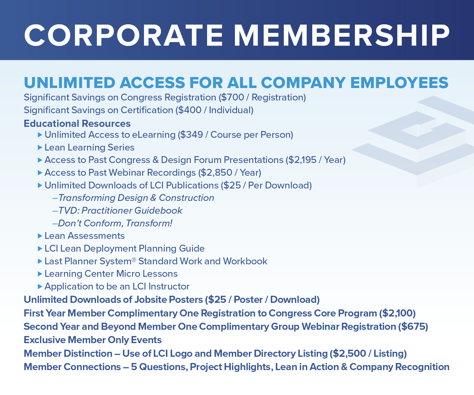 - Entry into the LCI Corporate Members Center with access to guides, templates, workbooks, reports, case studies and more.