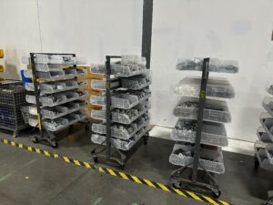 In their prefabrication shop, Rosendin prepares components in kitting packages for their field personnel. These assemblies are grouped by area and put onto wheeled carts or in organized cages, enabling workers to quickly gather the necessary items without having to frequently pause and locate materials.
