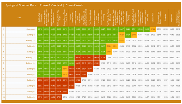 The project consisted of 12 two-story apartment buildings which were 24,000 square feet each, this included garages, pools, and a clubhouse which brought this project to a grand total of 309,319 square feet. Despite some delays, the clubhouse was delivered 2 months ahead of schedule and the overall project was completed 3 months ahead of schedule. CP has developed projects in 19 states employing top multifamily contractors using detailed CPM schedules. LBCC is the only CP contractor deploying both TPM and LPS®. These project results led CP to recommend that all contractors to use both TPM and LPS® production methods on future CP projects.